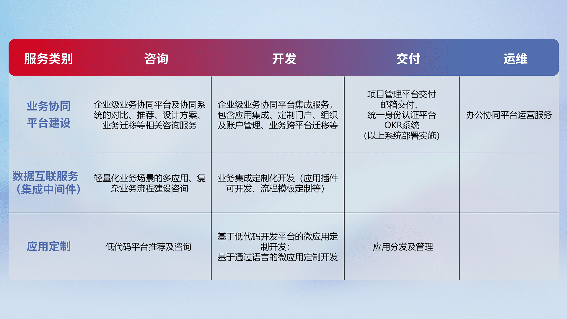 针对钉钉、、、企微、、、、IDaas等平台级产品提供产品的规划、、方案、、、交付、、、定制化开发等服务,,实现如统一协同办公、、、、智能客户服务、、、混合会议管理、、、、智能数据查询、、等业务场景,,实现数字化转型。。。